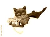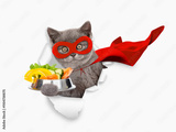 Cute kitten wearing superhero costume looking through the hole in white paper and holding bowl of vegetables
