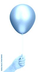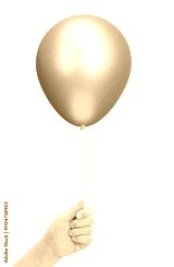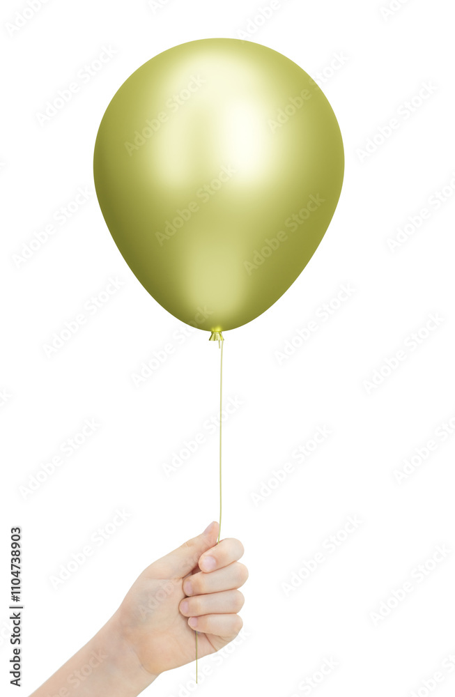 Female hand holding the golden or yellow balloon. Isolated on white background