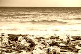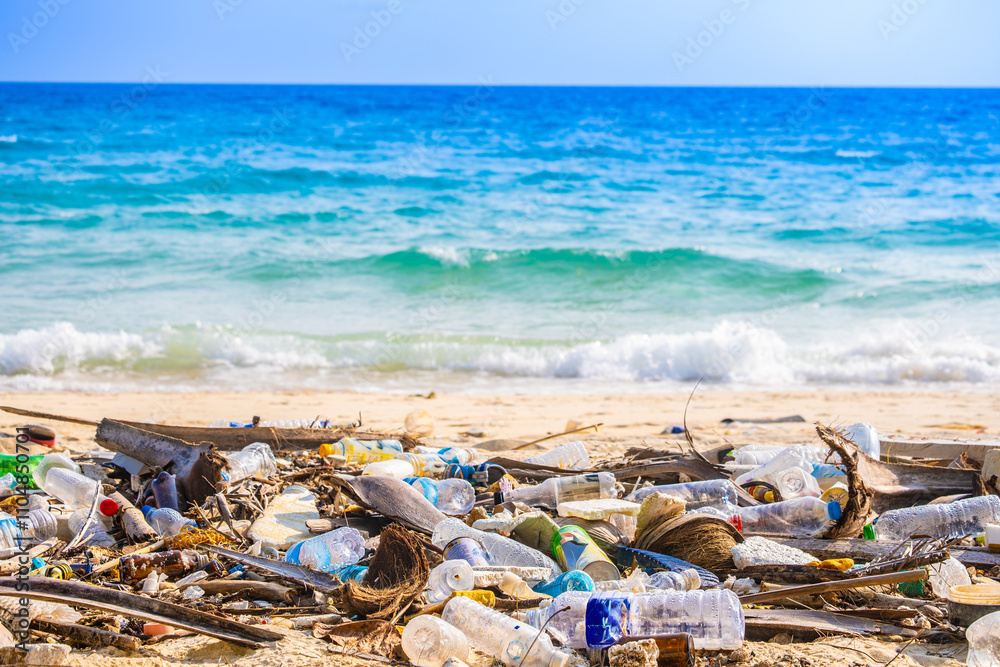 Trash, plastic cups and plastic bags at the beach. environmental problem concept and healing the world