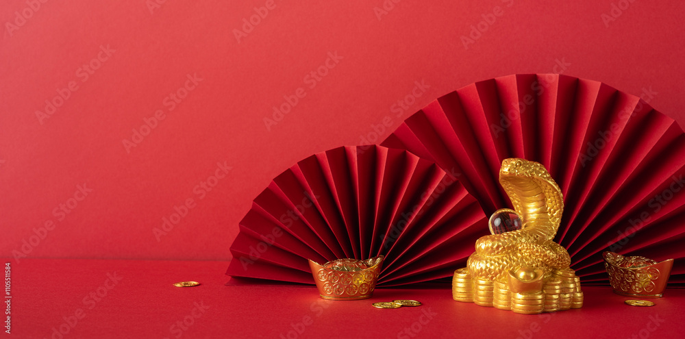 A vibrant red and gold themed setup showcasing traditional Chinese new year decorations, including a gold snake statue symbolizing the year 2025, complemented by red paper fans