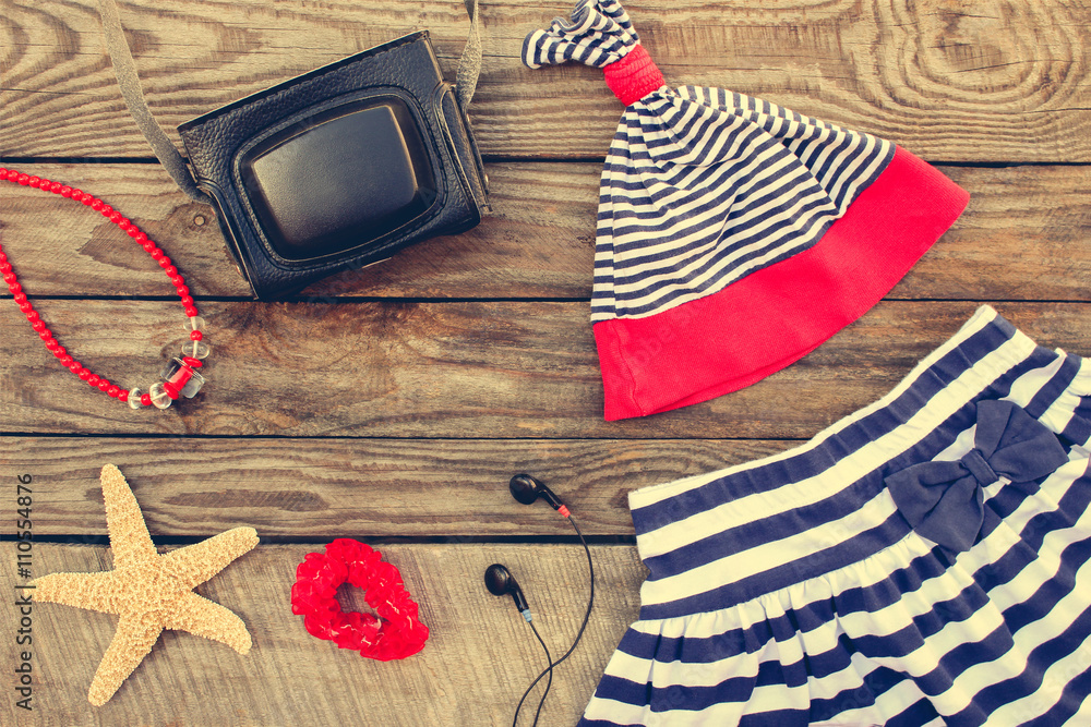 Summer children's clothing and beach accessories for your sea holiday on the old wooden background. Toned image.