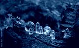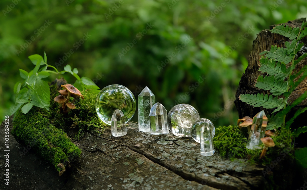 set of Crystal minerals in forest, abstract natural background. clear quartz gemstones for Magic Crystal Ritual, Witchcraft. spiritual esoteric practice for relax, meditation, harmony. stone therapy
