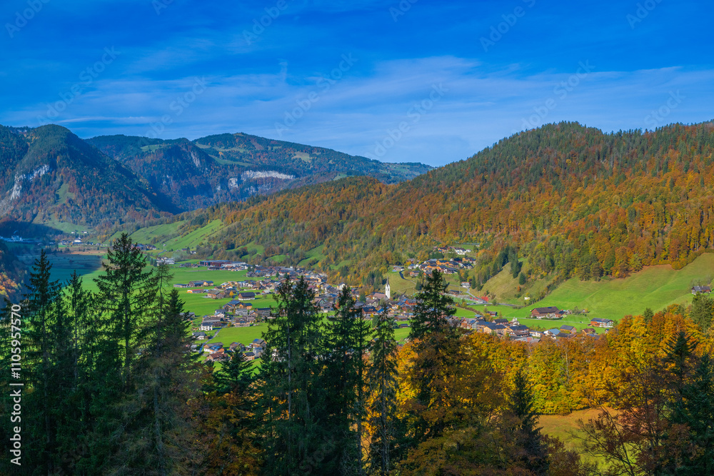 Fall Autumn in the Region of Bregenzerwald looking onto the Village of Bizau, State of Vorarlberg, Austria