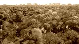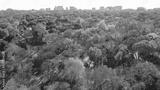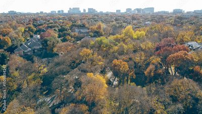Beautiful fall foliage at lush green upscale residential neighborhood in North Dallas, Texas, vibrant red yellow autumn leaves with downtown building skylines in distance background, aerial view