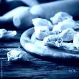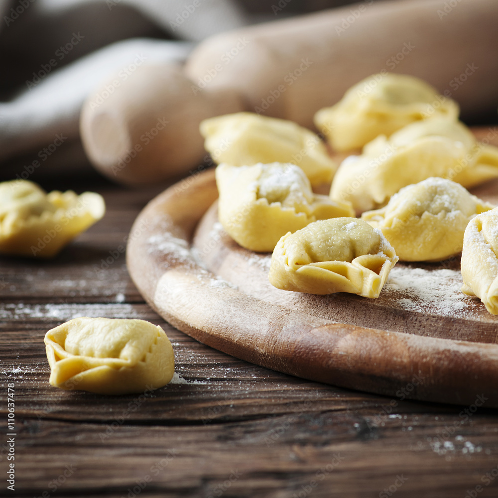 Italian homemade tortellini on the wooden table