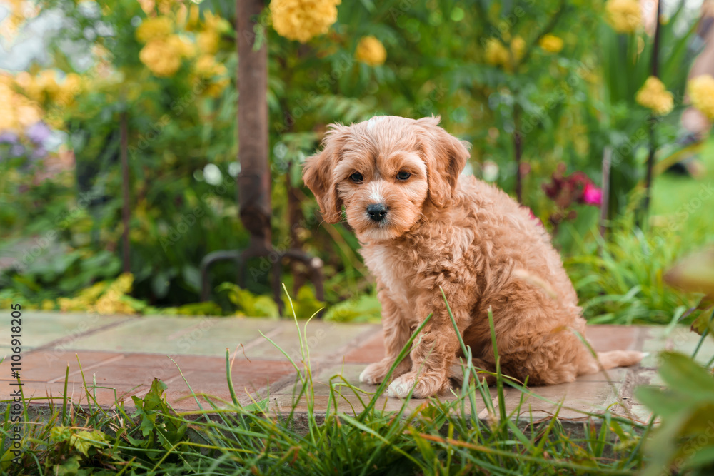 A puppy of a Cavapoo or Cockapoo breed dog in summer garden outdoor walking. Portrait of curly brown little Baby Maltipoo.