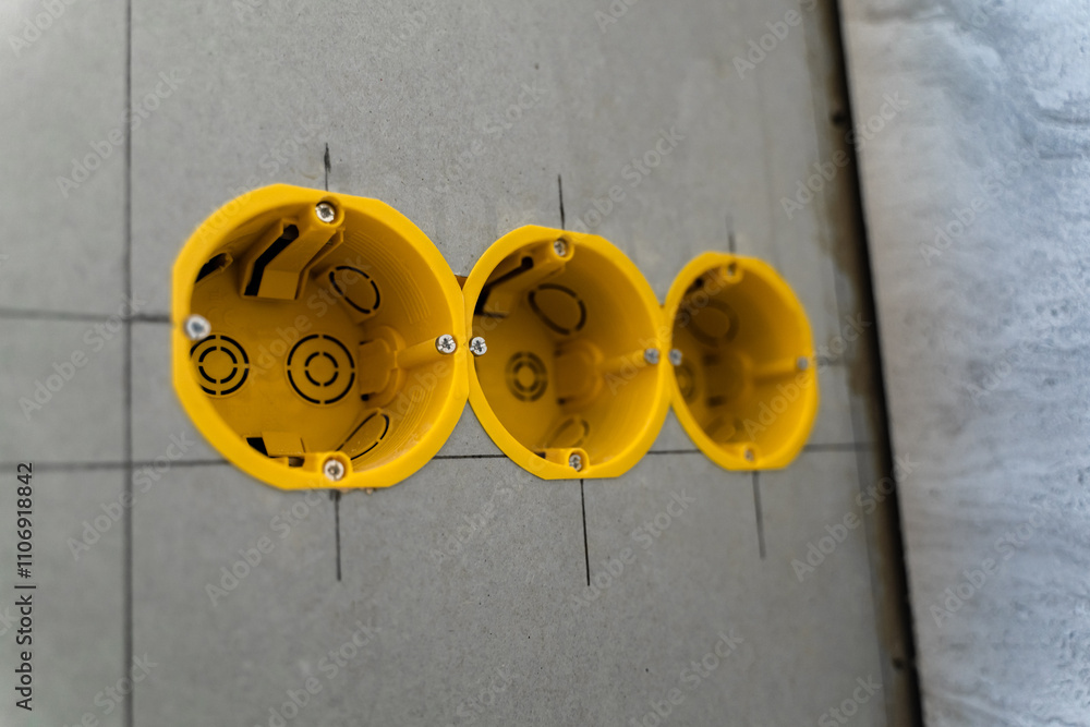 Renovation work in the room, new sockets, Electrician installing wall socket in new building, plastic socket boxes for repair