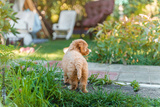 A puppy of a Cavapoo or Cockapoo breed dog in summer garden outdoor walking. Portrait of curly brown little Baby Maltipoo.