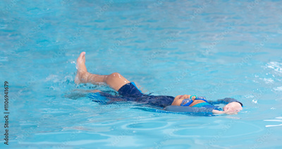 Kids girl in a blue swimsuit is swimming in the ิbackstroke.
