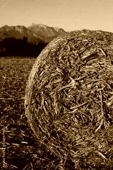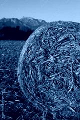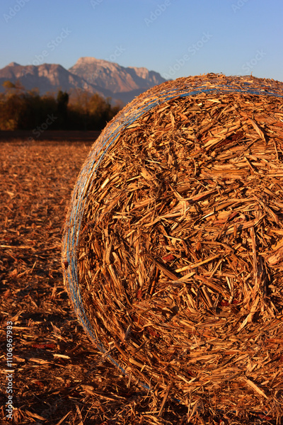 Dry hay bales on a harvested corn field on winter season. Agricultural landscape in northern Italy on a sunny day