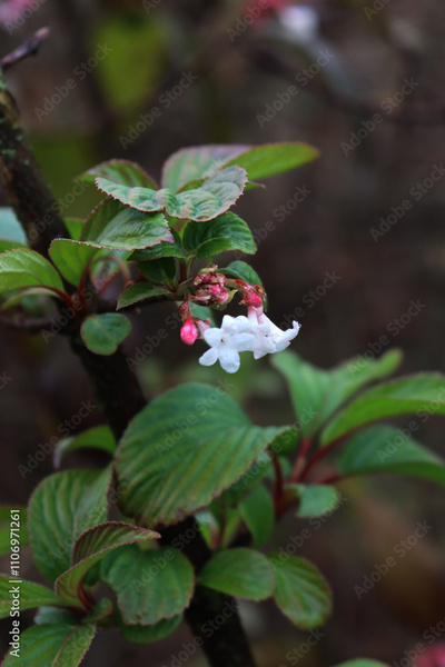 “Dawn” viburnum with pink flowers and green leaves covered by frost. Viburnum bodnantense on winter