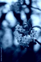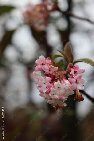“Dawn” viburnum with pink flowers and green leaves covered by frost. Viburnum bodnantense on winter