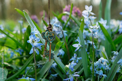 spring nature background. Vintage keys on blossoms meadow, abstract green backgdrop. Key, symbol of secret garden. Beautiful gentle fantasy floral image. template for design. soft focus