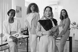 Diverse group of women standing in office, smiling and holding professional materials. Women from different ethnic backgrounds showcasing unity and professional attire
