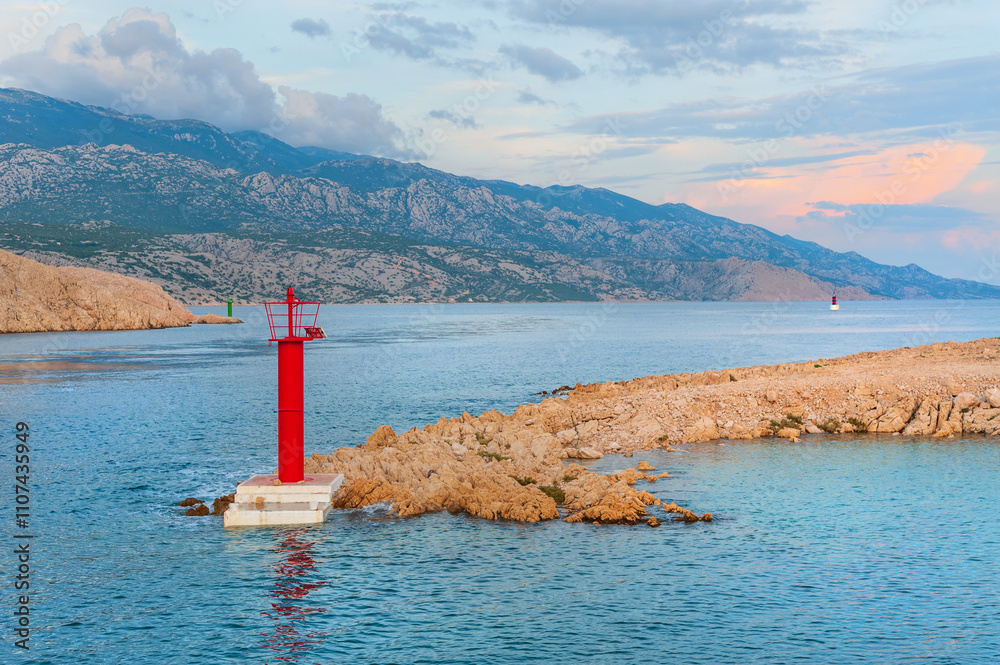 Red light tower at the entrance of Misnjak ferry port on Rab island with the view of Velebit mountain range, Adriatic coast of Croatia