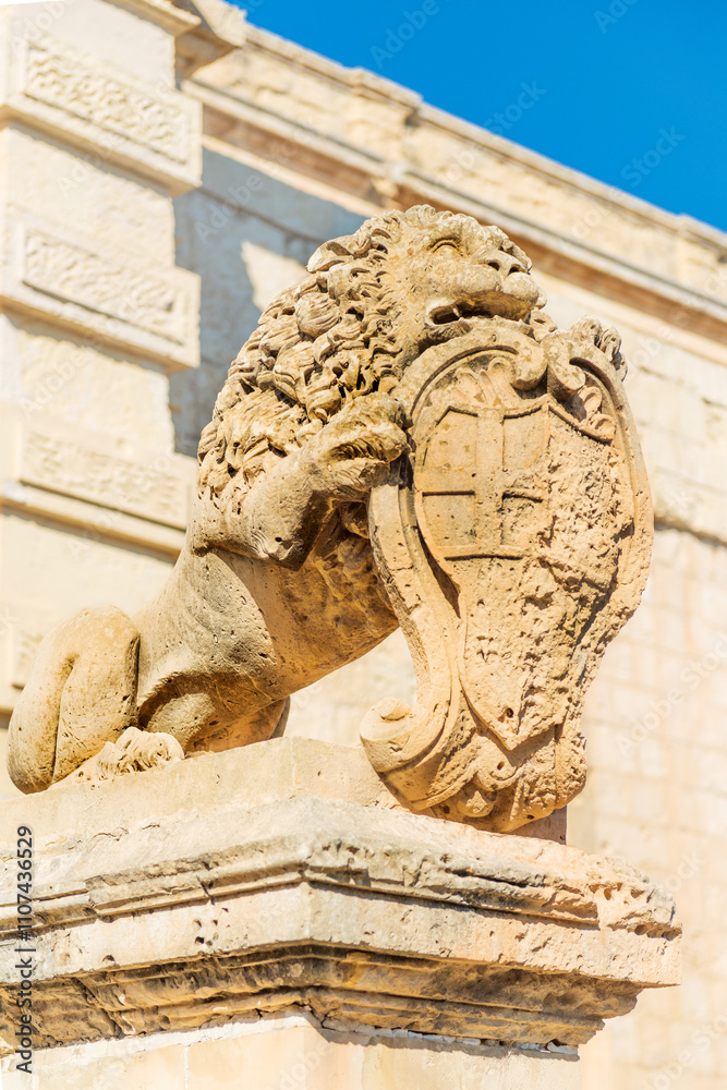 Lion statue with cote of arms by the main Vilhena Gate of ancient fortified Mdina, main landmark in the former capital of Malta