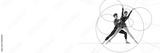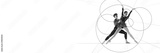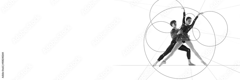 Banner. Cotemporary art collage. Two ballet dancers create synchronized pose within geometric framework, symbolizing balance and partnership in motion. Concept of sport, modern art.
