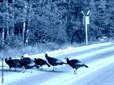 Wild turkeys walking across a highway