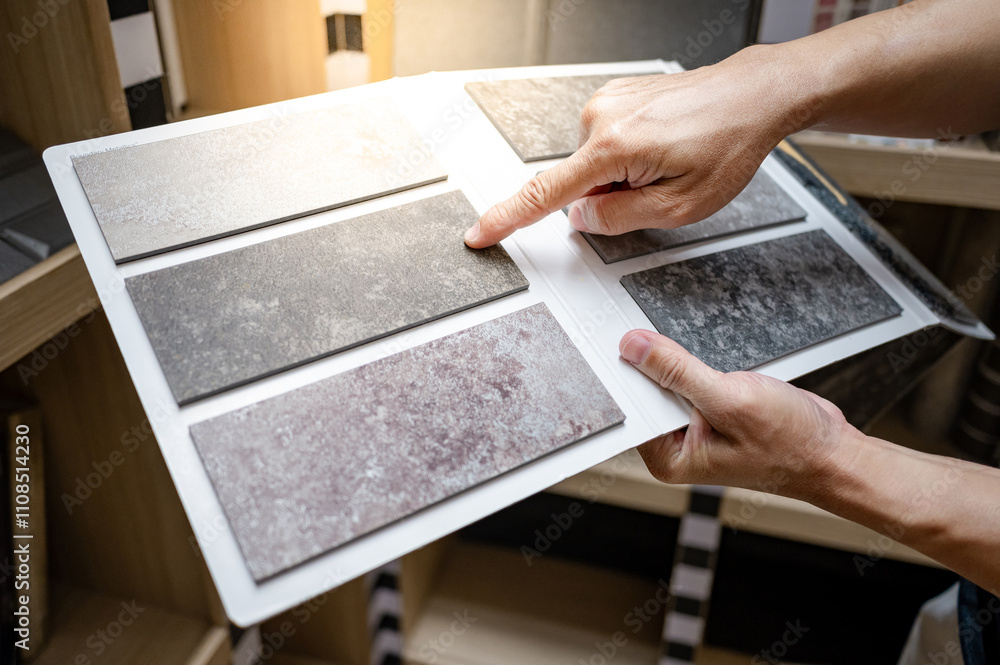 Flooring material design collection. Designer hand pointing at stone tile sample on display catalog. Customer choosing rough texture and pattern for floor finishing at home design store