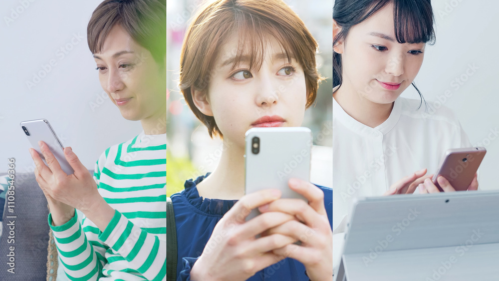 スマホ、スマートフォン、女性、携帯電話、アプリ、モバイル、動画、SNS、メール、コラージュ、タイトル、テンプレート、イメージ、広告、女子、ミドル、若者、Z世代、若い、20代、40代、50代、シニア、世代、IoT、ICT、テック、テクノロジー、ネットワーク、コミュニケーション、webサイト、インターネット、オンライン、通信、5G、予約、クーポン、キャリア、日本人、認証、連絡、コミュニティ、メッセージ