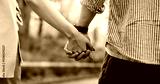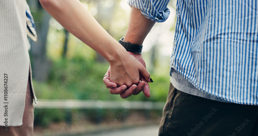 Couple, back and outdoor with holding hands, walk and support for romantic getaway or connection. Woman, man and bonding as together for solidarity, love or weekend as tourist for travel in Indonesia