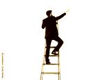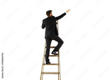 Man in formal attire climbing a step ladder, reaching upward, isolated on a white background. Concept of ambition, success, and effort