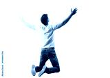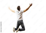 Back view of a man kneeling with arms wide open in a white shirt and jeans on a white background. Concept of freedom and celebration
