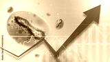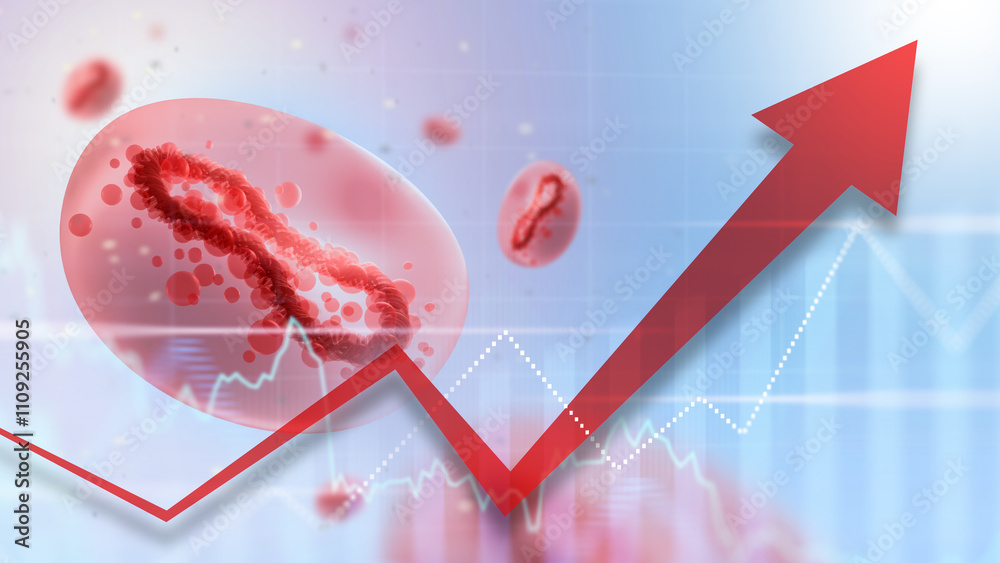 Monkeypox epidemic. Increase in number of diseases. Molecule mpox. Arrow shows increase in deaths from virus. Spread of monkeypox infection. Epidemiological background. Virus cell. 3d image
