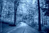 Fall Autumn in the Austrian Alps with colorful leaves and path or small street leading into the woods. State of Vorarlberg, Austria