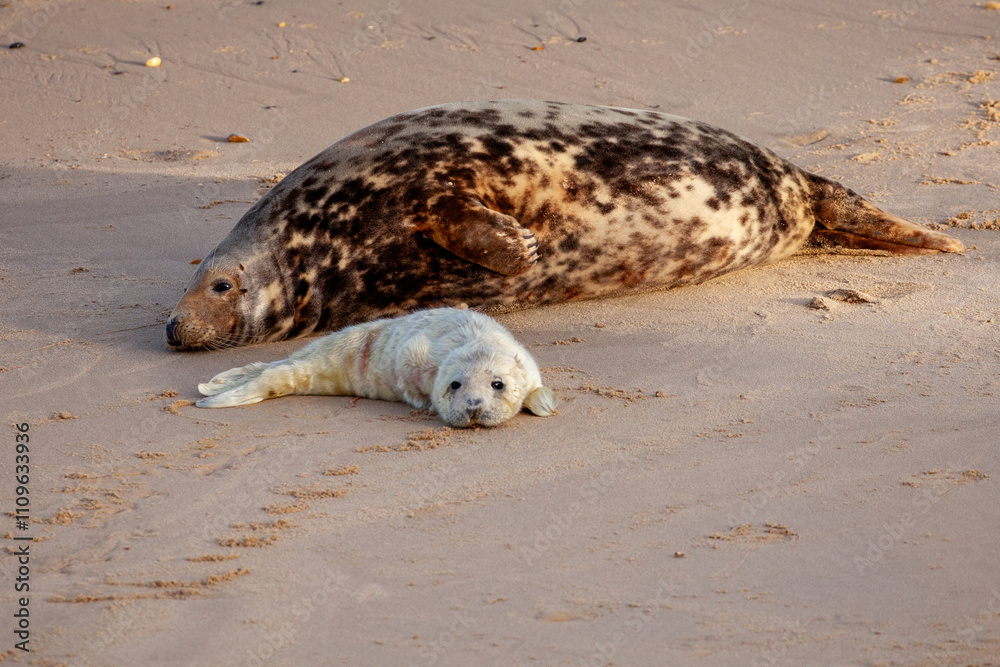 Cute baby seal and mother on Norfolk beach UK