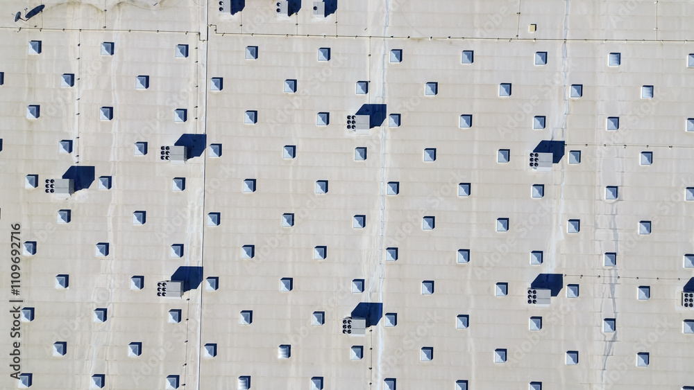 Close-up rooftop AC units air conditioners RTU on top of large grocery store in Texas, commercial packaged on flat roof, HVAC conditioning cooling, dehumidifying, heating, heat pump, air handlers