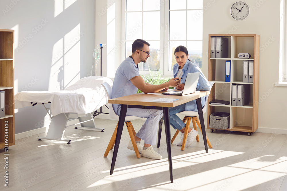 Dedicated doctor engages in a medical consultation with a patient in the hospital office, utilizing laptop and technology. Providing medical advice and discussing personalized healthcare solutions.
