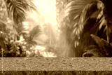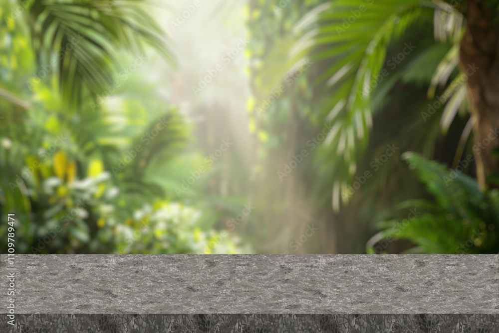 Natural stone and concrete podium in Natural green background for Empty show for packaging product presentation. Background for cosmetic products, the scene with green leaves. Mock up the pedestal.