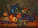 A still life with a jug and fruits is an oil painting on canvas. Oil painting. A picture with ripe ones. Fruit.