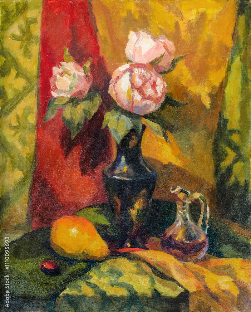 A bouquet of pink peonies is an oil painting on canvas. A painting with bright colors. Oil painting. Flowers. Pions. Vertical image.