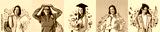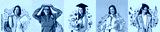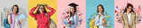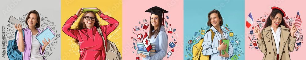 Set of female students in drawn clothes on color background