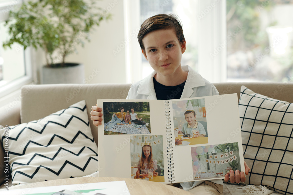 Portrait of boy with family album sitting on sofa in the room