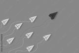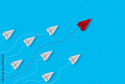Leadership or different concept with red and white paper airplane path and route line on blue background