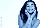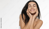 Clean healthy skin beauty routine. Woman with sleek healthy black hair and glowing skin, smiling and touching smooth dewy skin. Photo for advertisements in beauty, health and wellness