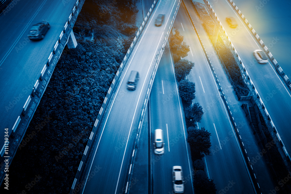 aerial view of traffic on chongqing overpass on a sunny day,china,blue toned image.
