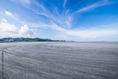 Asphalt road square and sky clouds background. Outdoor asphalt parking lot.
