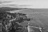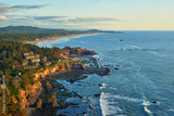 Scenic Oregon Coastline at Sunset: Dramatic Cliffs, Serene Shoreline, and Pacific Ocean Waves with Coastal Trees and Blue Evening Sky