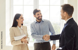 Team of colleagues exchange a handshake during an productive office meeting to finalize a successful financial deal. Teamwork, negotiation, and professional partnership agreements.