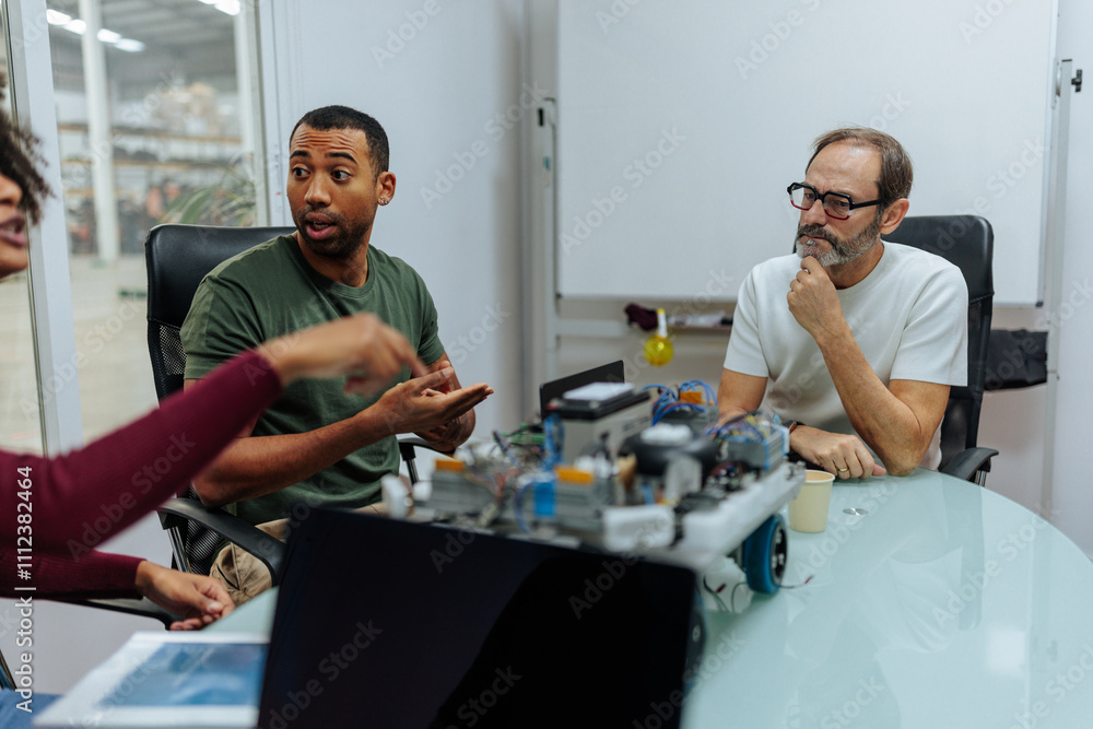 Engineers collaborating on robotics project in modern office