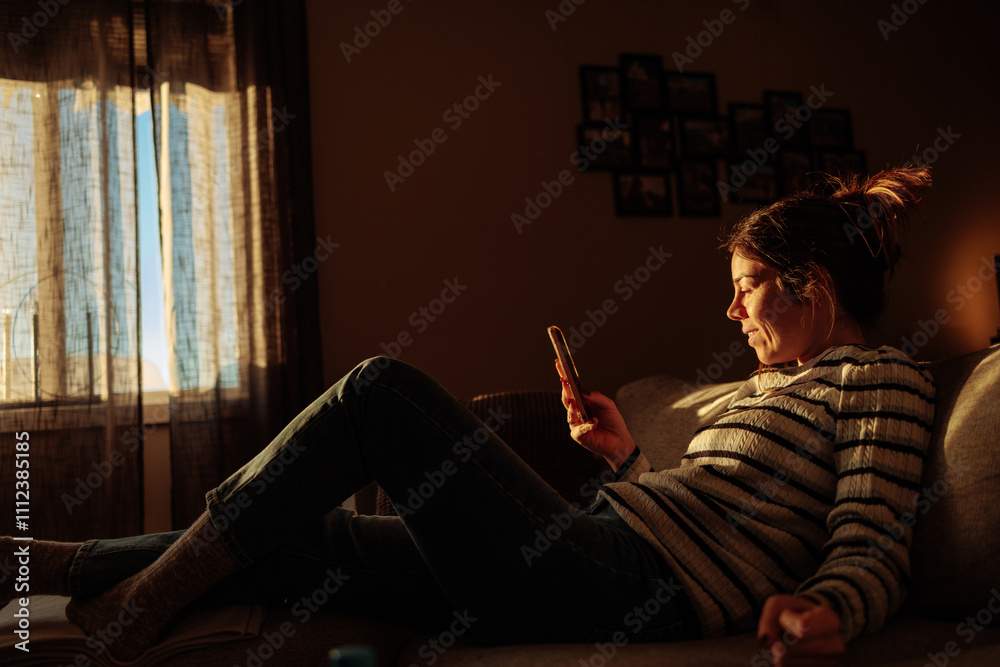 Woman relaxing on sofa using smart phone in cozy living room