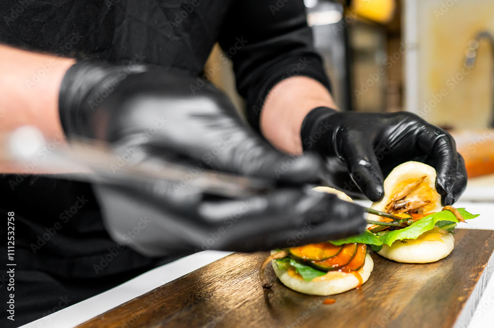 A chef in black gloves carefully assembles a delicious bao bun with fresh herbs and fillings, showcasing culinary skill and attention to detail in a vibrant kitchen setting.