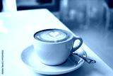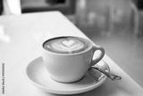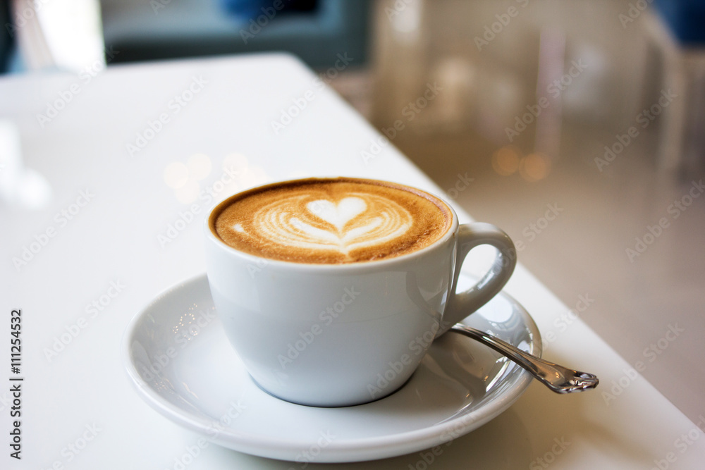 white cups of Cappuccino coffee with froth heart shaped on table