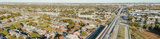 Panorama aerial view Belt Line Road with light railroad and precast concrete walls noise barrier, sound mitigation in residential area downtown Dallas background, absorptive acoustic quiet zones