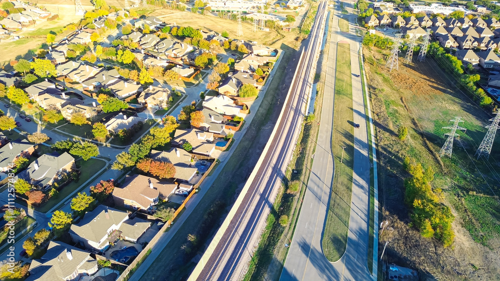 Suburban residential neighborhood with precast concrete walls noise barriers, sound mitigation light railroad Belt Line Road in Coppell, Texas, absorptive acoustic establishes quiet zones, aerial