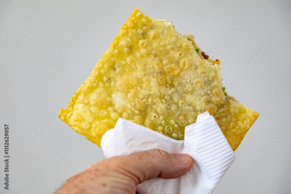 Traditional Brazilian fried pastry stuffed with ground beef. "Pastel de feira".